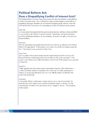 The Political Reform Act has a four-step process for deciding whether a disqualifying