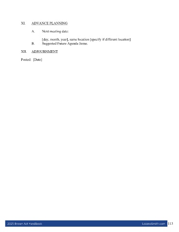 XI. ADVANCE PLANNING A. Next meeting date: [day, month, year], same location [specify if different location] B. Suggested Future Agenda Items. XII. ADJOURNMENT Posted: [Date] 2025 Brown Act Handbook LozanoSmith.com 113
