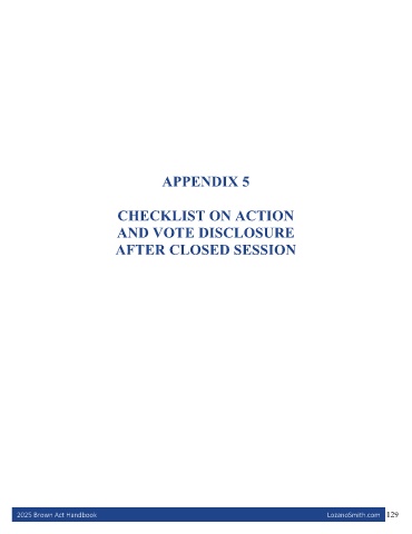 APPENDIX 5 CHECKLIST ON ACTION AND VOTE DISCLOSURE AFTER CLOSED SESSION 2025 Brown Act Handbook LozanoSmith.com 129