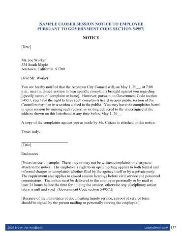 [SAMPLE CLOSED SESSION NOTICE TO EMPLOYEE