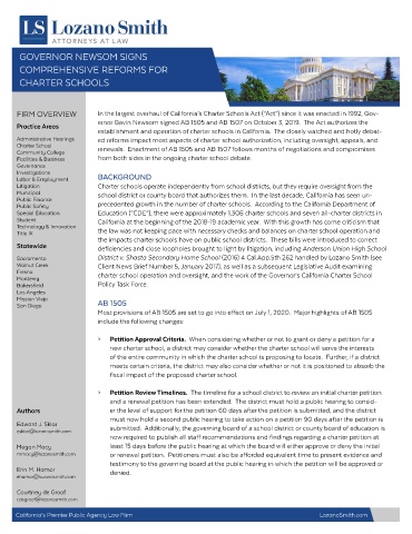 FIRM OVERVIEW In the largest overhaul of California’s Charter Schools Act (“Act”) since it was enacted in 1992, Gov-